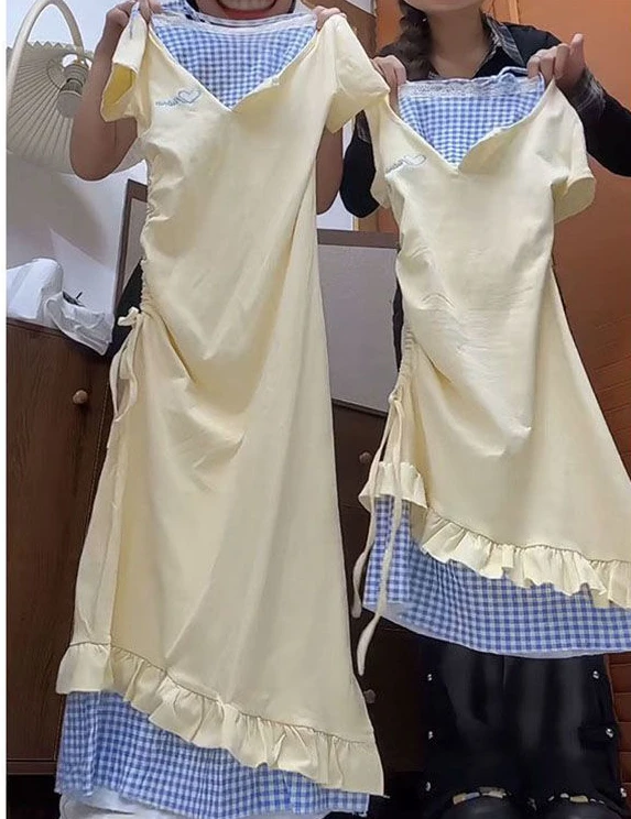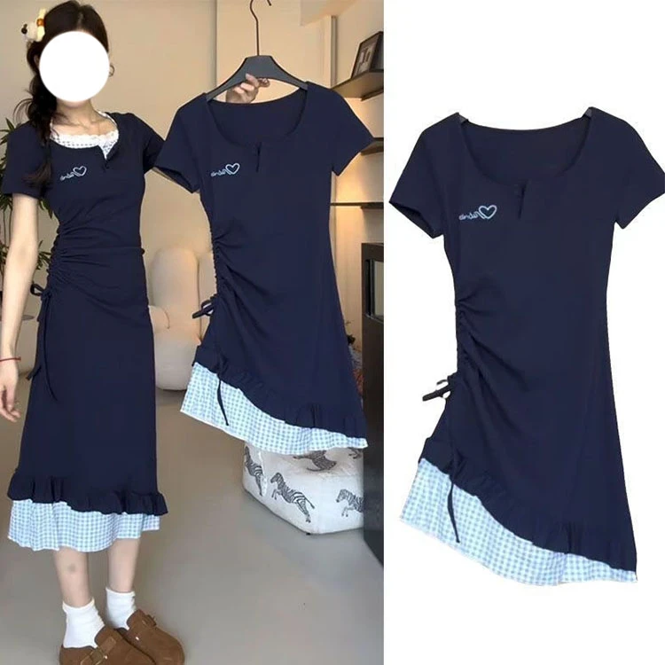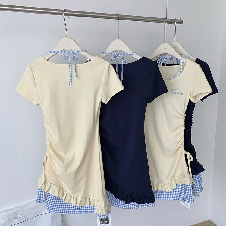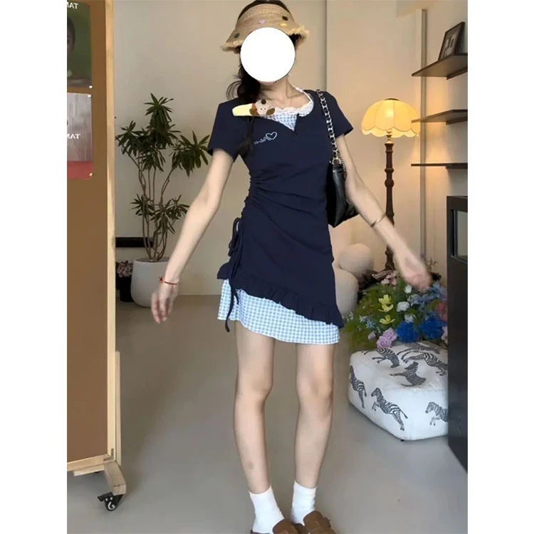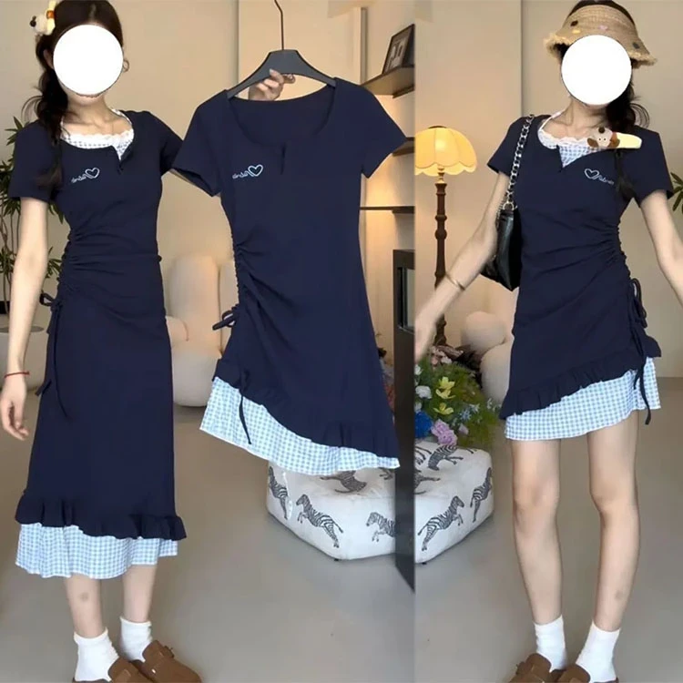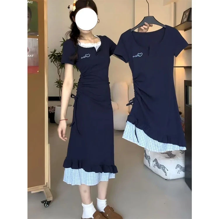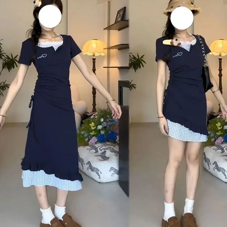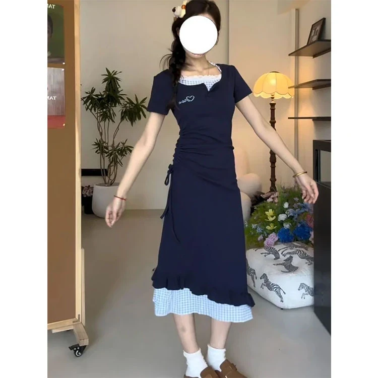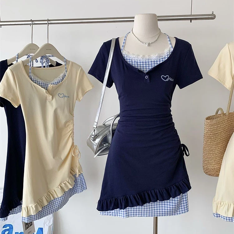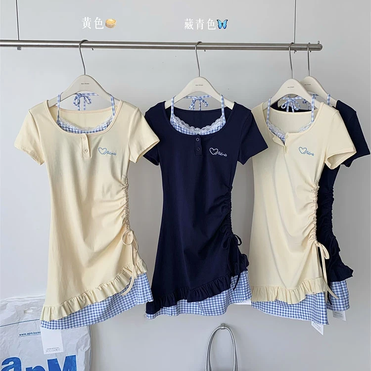 French sweet short sleeve fake two pieces dress women's spring summer ruffles drawstring waist-tight pure desire halter long skirt